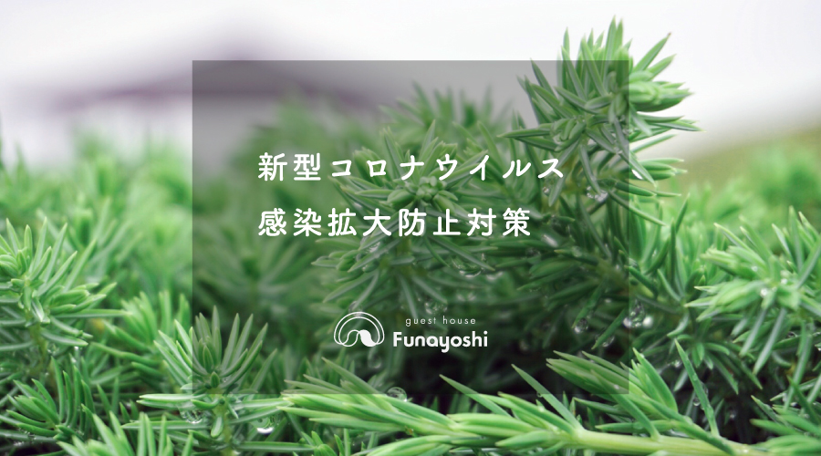 ゲストハウス舟吉では、お客さまの安心・安全を第一に、withコロナ時代に対応するサービスの構築に日々努めています。私どもの施設は、定員24名程(団体につきましては1階広間の活用など相談可)のゲストハウス(民宿)ですので、「三つの密(密閉・密集・密接)」になり易い環境にあります。このことを踏まえ、スタッフ自らの感染拡大防止のための取り組みと同時に、除菌効果のある清掃、ドアノブ・各種スイッチなど直接手に触れるものに関しての清掃、こまめな換気等の徹底に努めています。その上でのお客さまへの現段階での対策は以下の通りですので、ご理解・ご協力をよろしくお願いいたします。